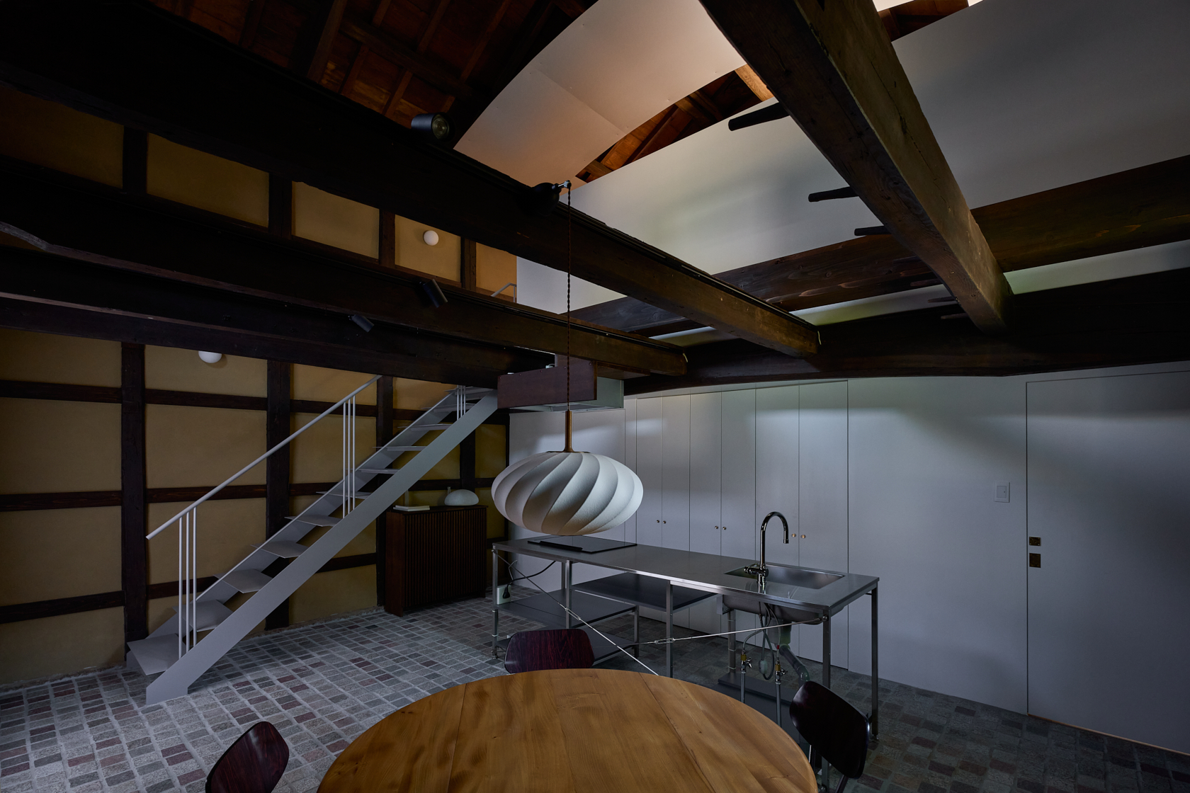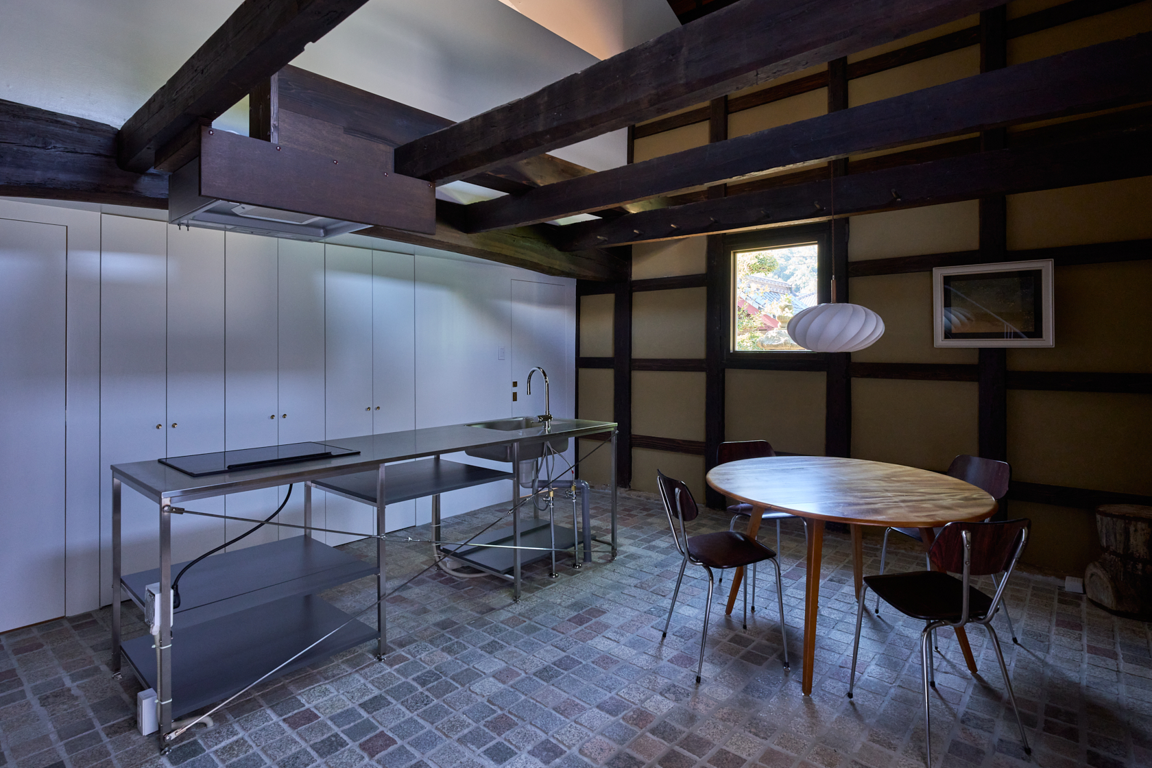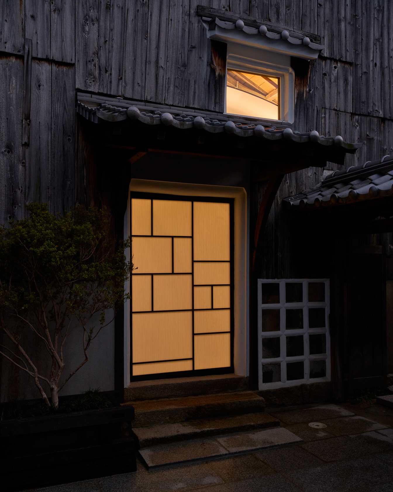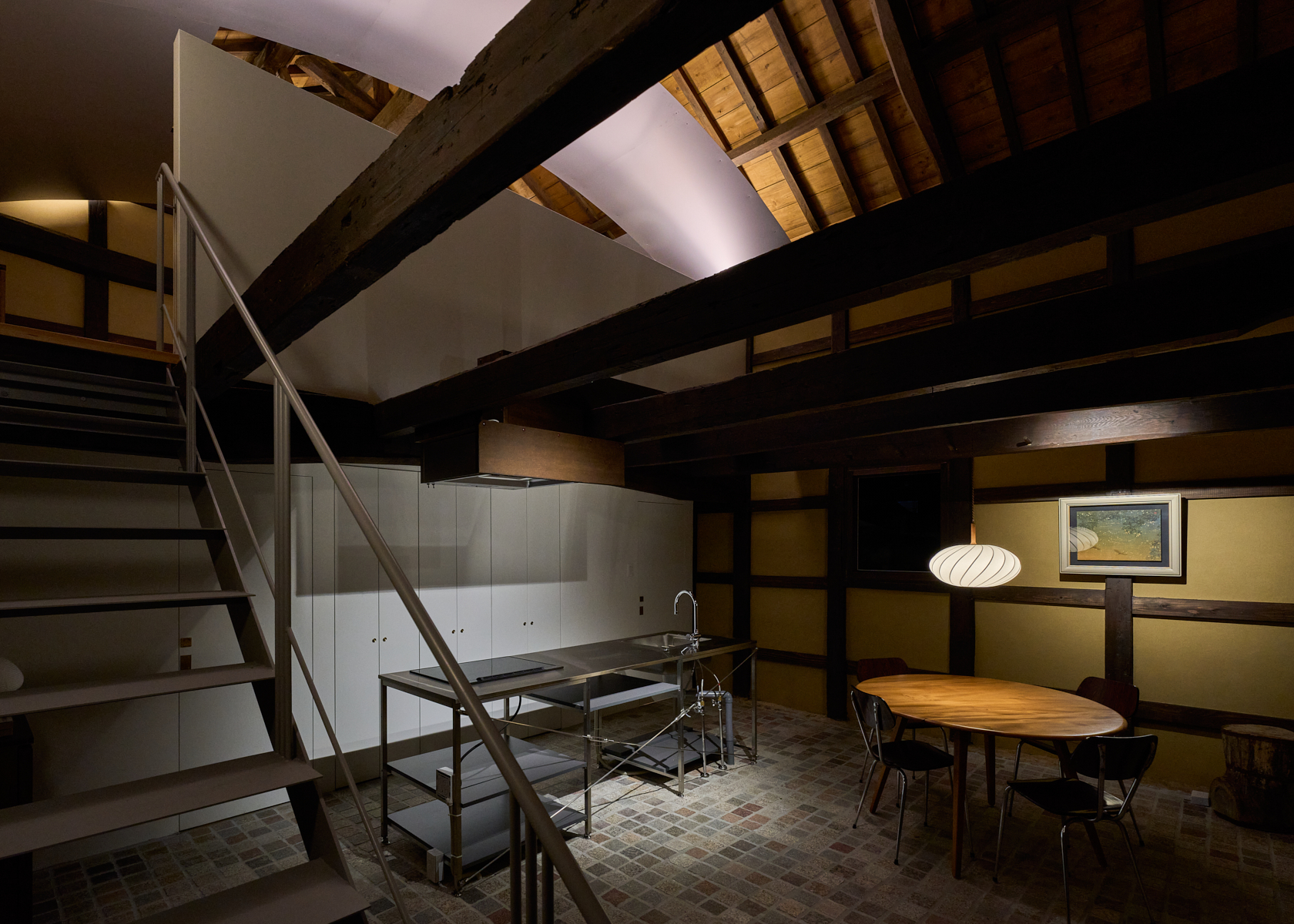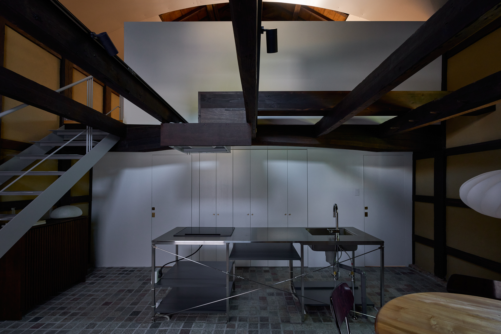 静寂の中で本を読んだり、仕事に没頭したり、小説家やアーティスト、そしてゆったりとした時間を求める人々が心静かに過ごせる創造的な場所を目指しています。ここでは古民家の価値を尊重しつつ、現代のデザインやアートを融合させた保存と再生の融合をテーマに再構築。建材には、東京国会議事堂の外壁にも使用された倉橋の桜御影石を採用し、庭や蔵の石畳などに地元石を再利用しました。さらに蔵内部では反射するアルミ屋根と照明によって、古民家の闇と光が対話する空間を創出しています。