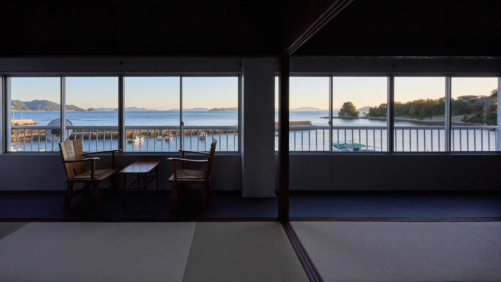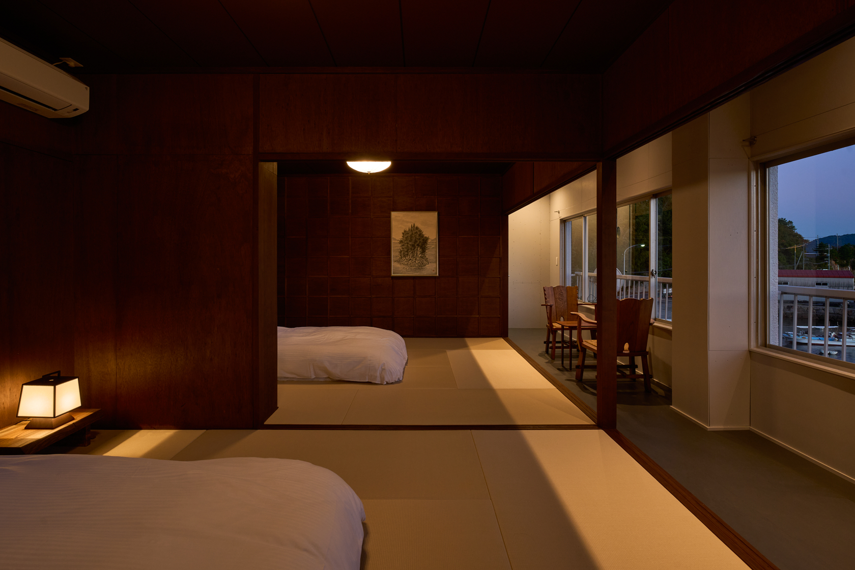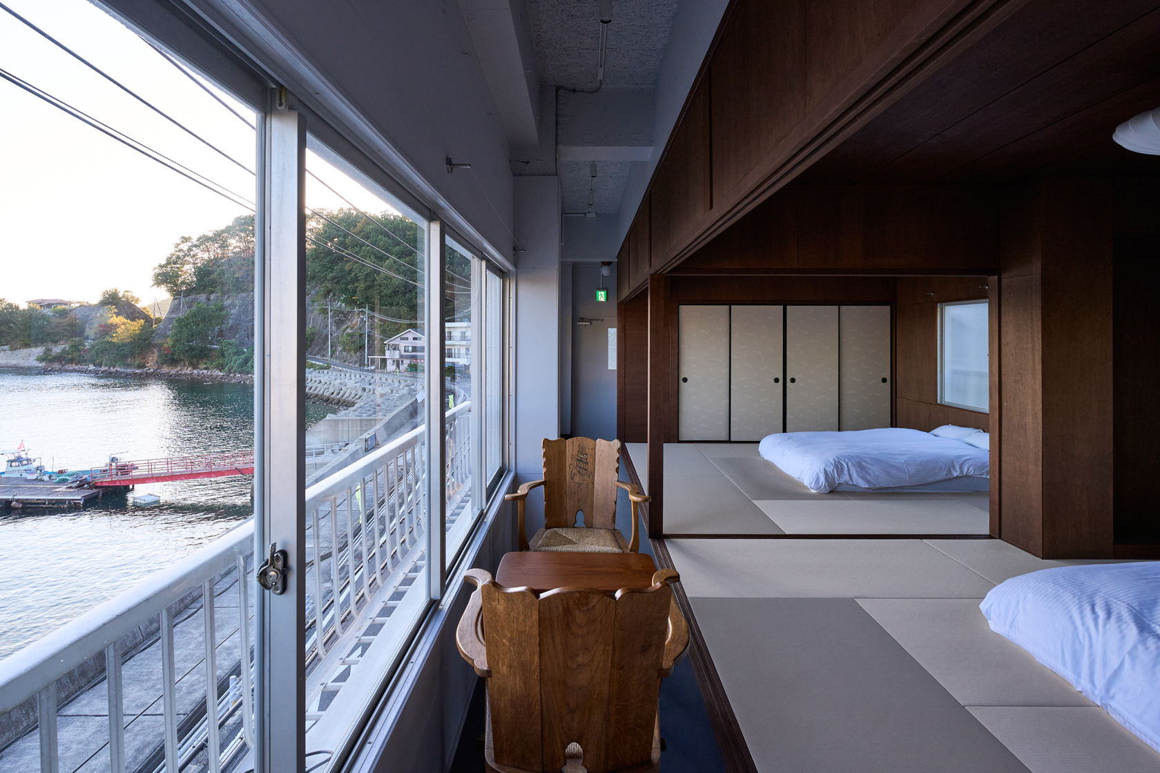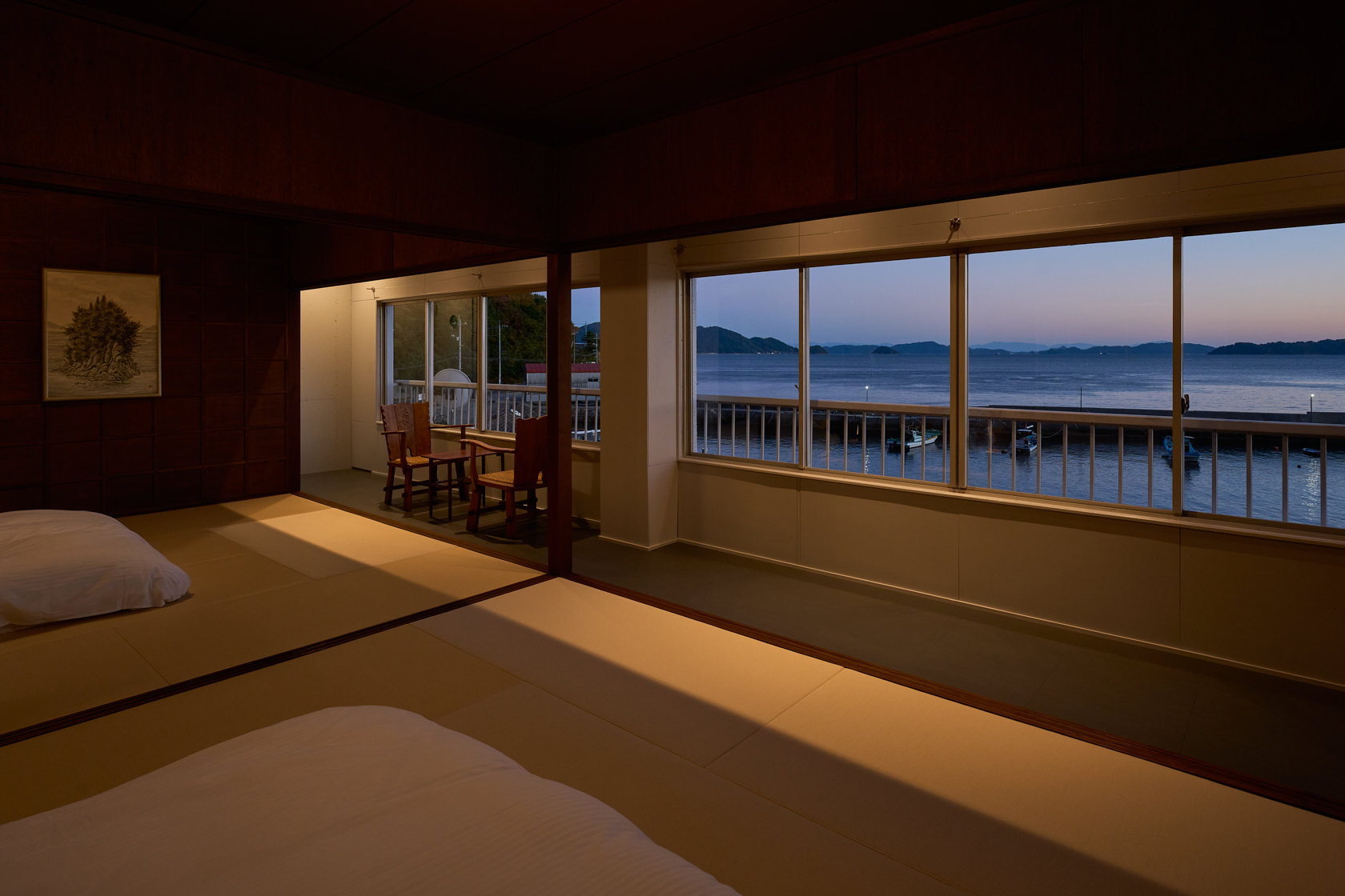 木造の軽やかさと温もりを生かし、ALY HOTELの共通テーマである「アートスペースとしての宿」を体現しています。建物の窓際からは瀬戸内の海を一望でき、ゆったりとした時間の中で夕陽を眺めながら過ごせる、特別な場所です。室内にはアートや工芸の要素を織り込み、実際の風景と作家の描く風景、両方の“倉橋の景色”を楽しめる空間となっています。