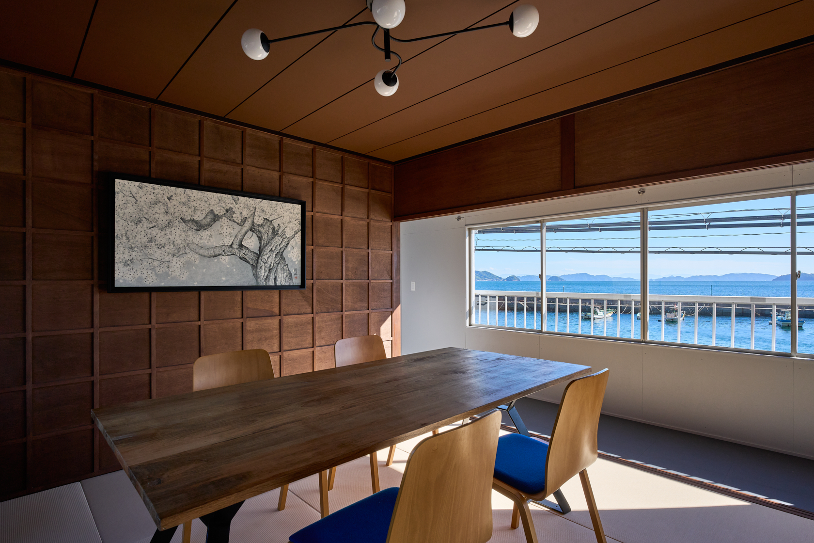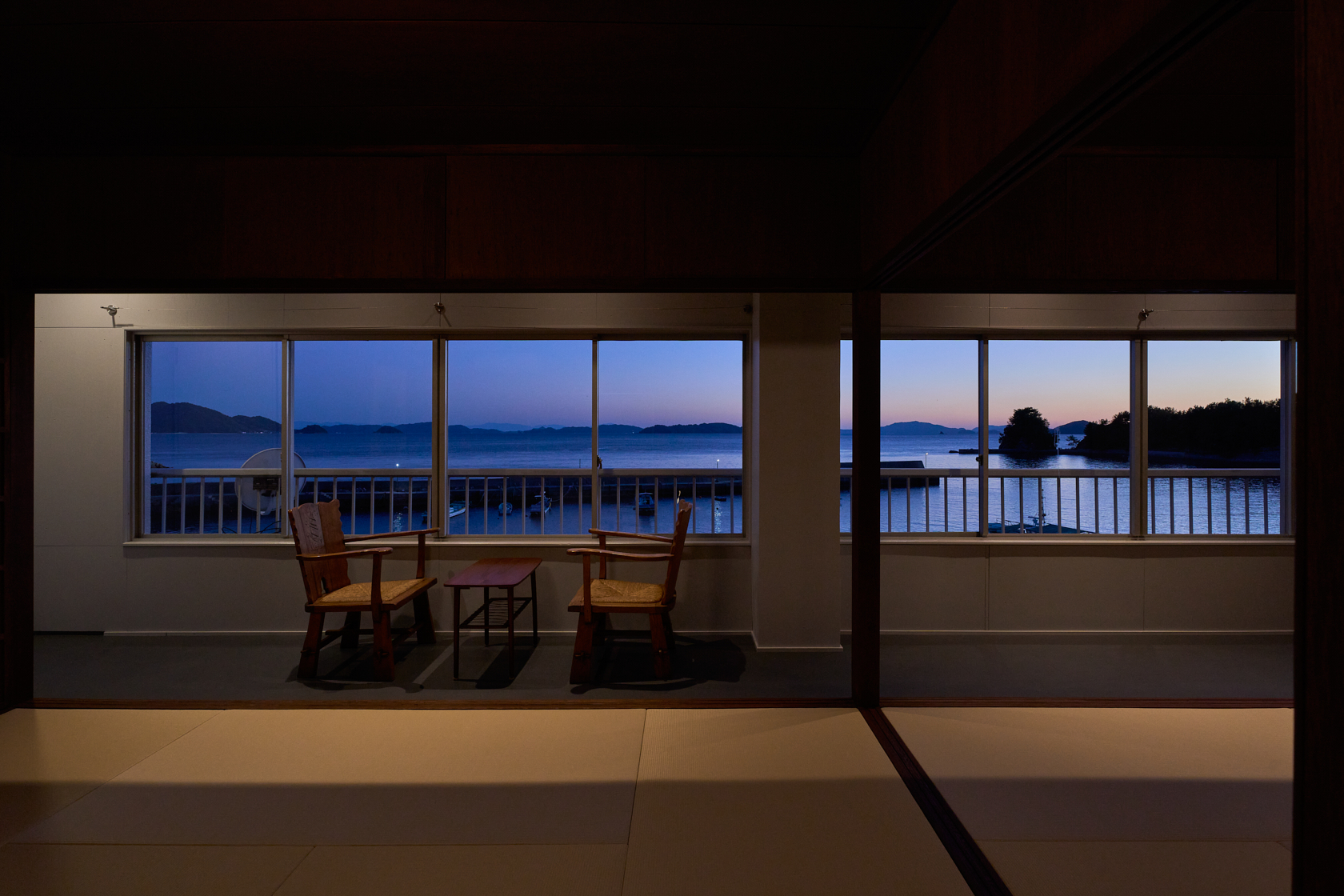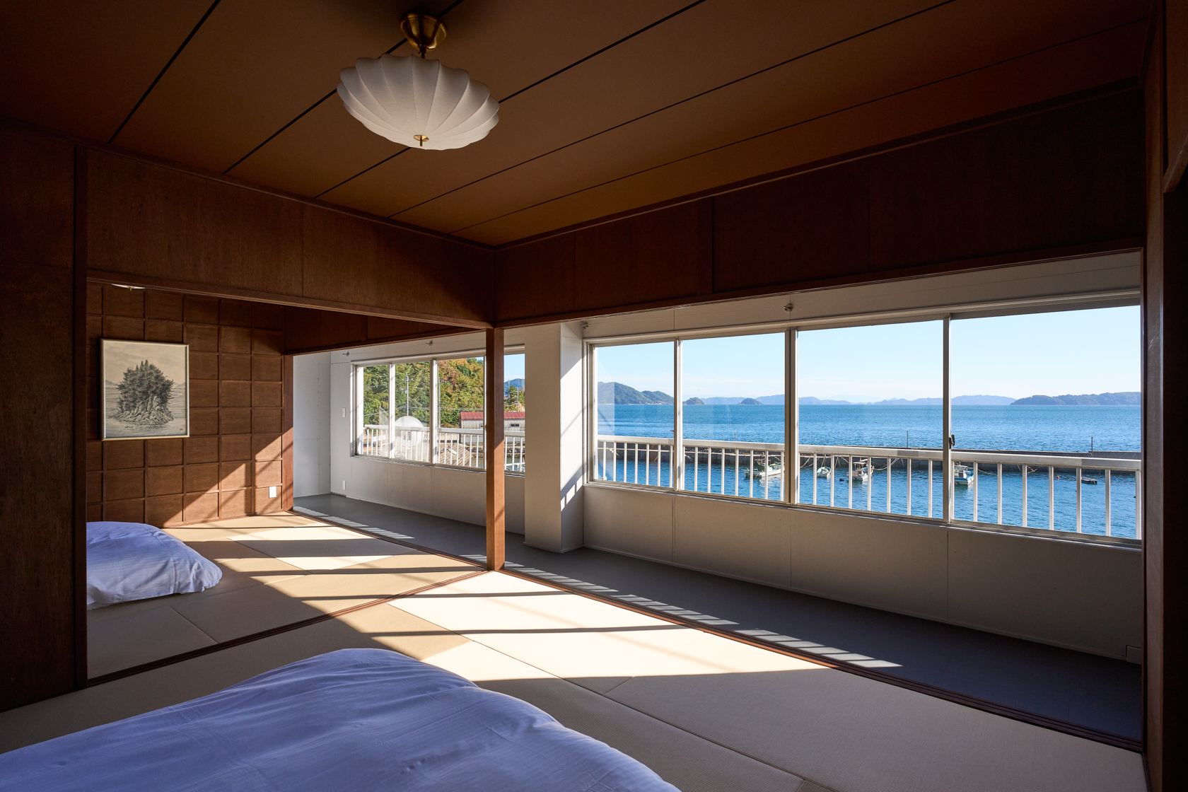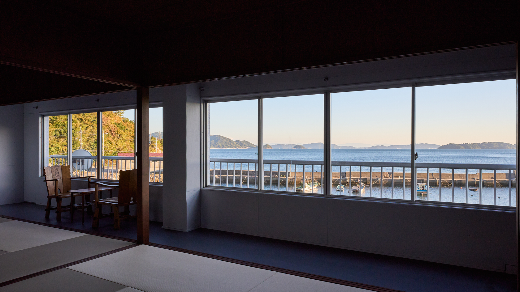 木造の軽やかさと温もりを生かし、ALY HOTELの共通テーマである「アートスペースとしての宿」を体現しています。建物の窓際からは瀬戸内の海を一望でき、ゆったりとした時間の中で夕陽を眺めながら過ごせる、特別な場所です。室内にはアートや工芸の要素を織り込み、実際の風景と作家の描く風景、両方の“倉橋の景色”を楽しめる空間となっています。